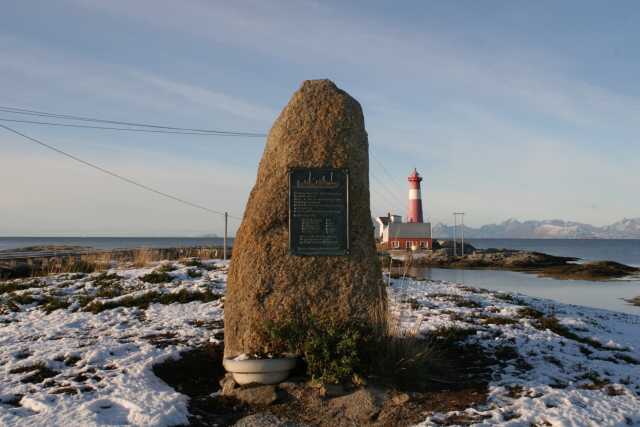 Ein Gedenkstein bei Tranøy fyr erinnert an die Versenkung des Hurtigrutenschiffes D/S "Barøy" am 09. Dezember 1941.