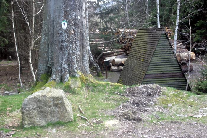Am Fuß des Baums steht ein Stein mit Innenschrift.
