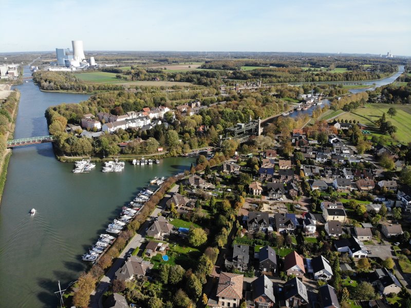 | Der Schleusenpark Waltrop am Dortmund-Ems-Kanal und Rhein-Herne-Kanal. Deutschland, Nordrhein-Westfalen. 26.10.2019; Flug Nr. 202 |