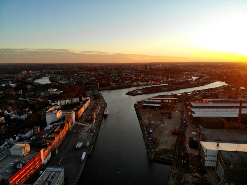 | Blick auf den Hafen von Lübeck. Deutschland, Schleswig-Holstein. 30.12.2019; Flug Nr. 218 |
