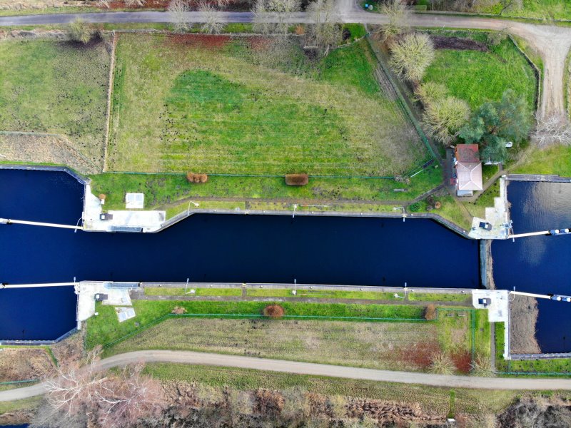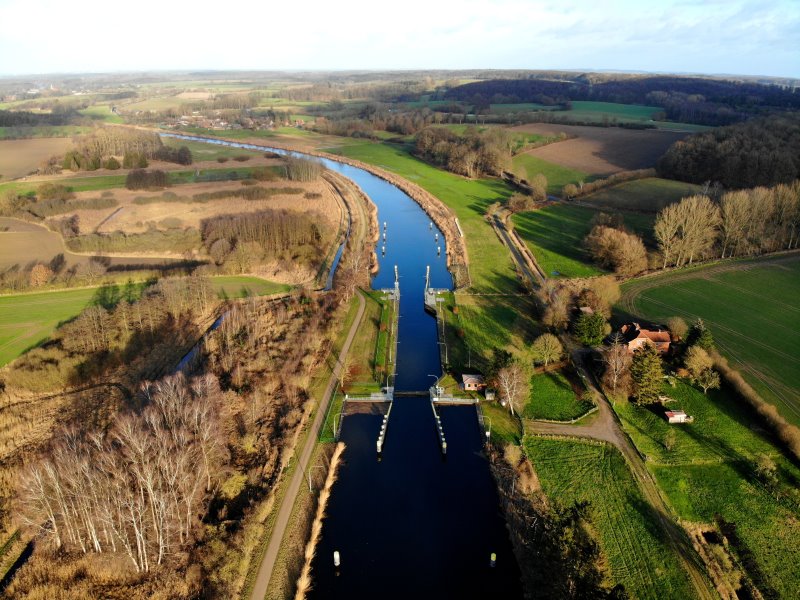 | Die Schleuse Behlendorf am Elbe-Lübeck-Kanal. Deutschland, Schleswig-Holstein. 31.12.2019; Flug Nr. 222 |