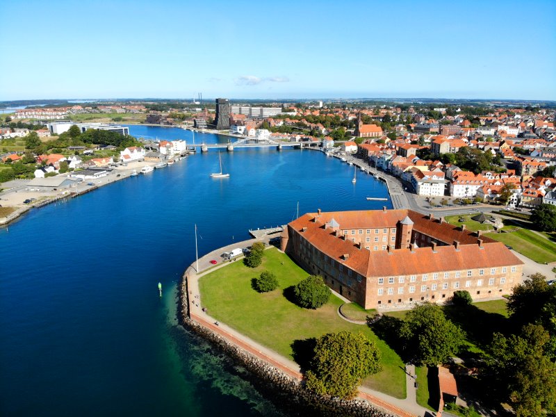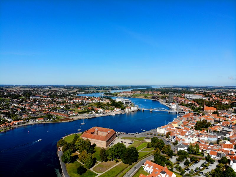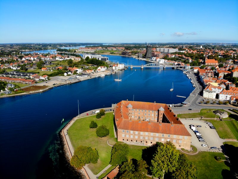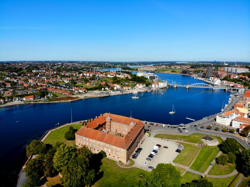 | Blick auf das Schloss Søderborg und dem Als Sund. Dänemark, Region Syddanmark 18.09.2020; Flug Nr. 412 |