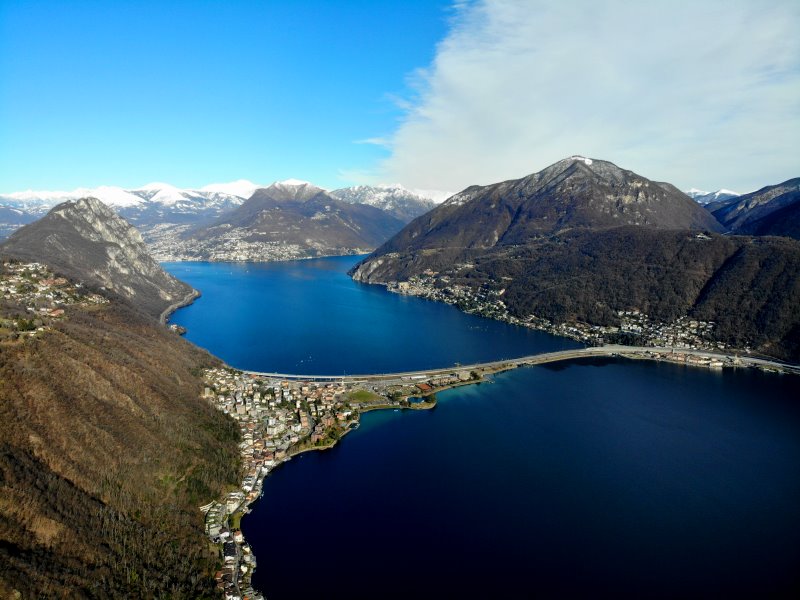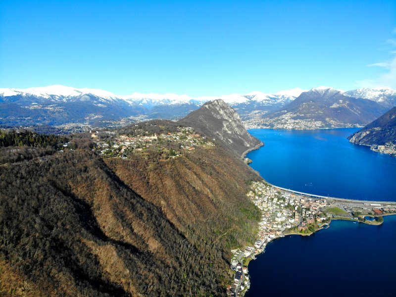 | Flug über den Lago di Lugano mit Blick auf Melide (unten), Carona (oben) und Lugano im Hintergrund. Schweiz, Kanton Tessin 24.01.2021; Flug Nr. 468 |