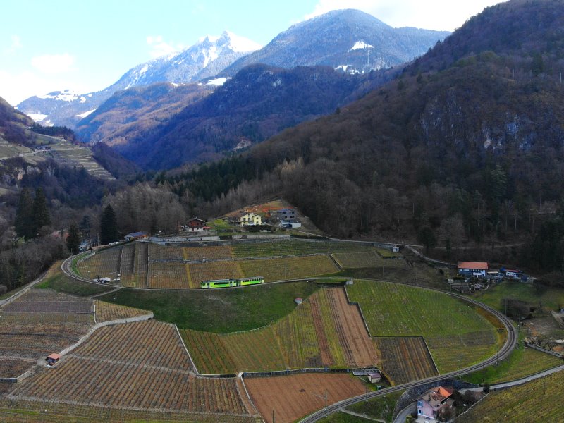 | Wie auf einer Modelleisenbahnanlage windet sich ein Zug der TPC durch die Weinberge von Aigle. Schweiz, Kanton Vaud 20.03.2021; Flug Nr. 493 |