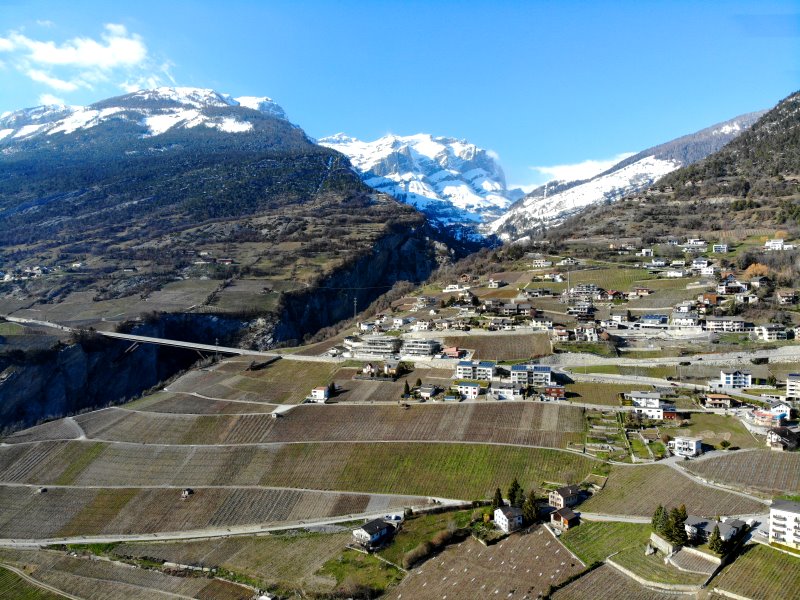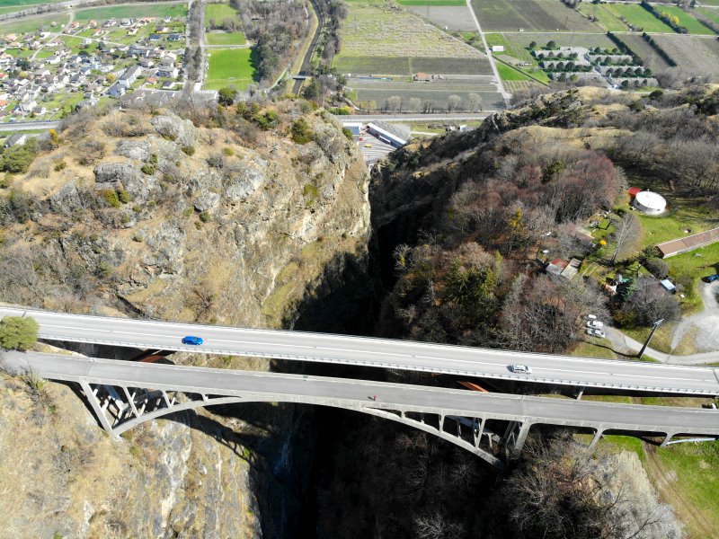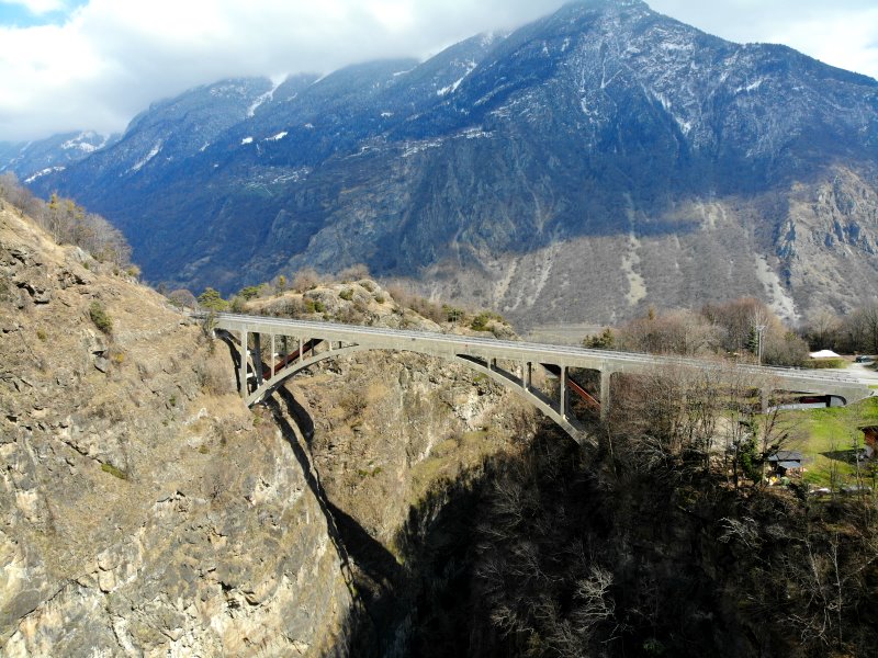 | Die Pont de Gueuroz war bis 2017 die höchste Straßenbrücke der Schweiz. In 187 m Höhe überquert sie die Treint-Schlucht. Schweiz, Kanton Wallis 20.03.2021; Flug Nr. 494 |