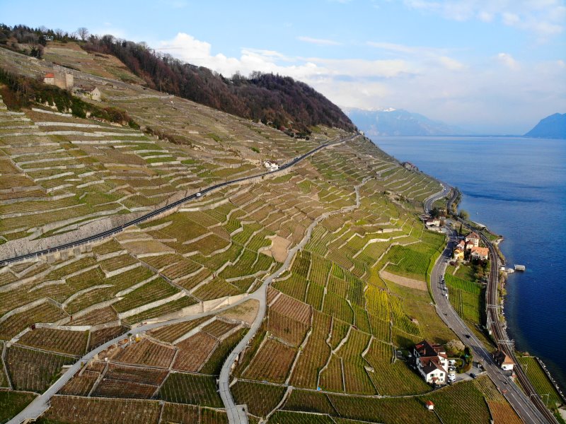 | Blick auf die Weinberge des Lavaux bei Cully. Schweiz, Kanton Vaud 16.04.2021; Flug Nr. 508 |