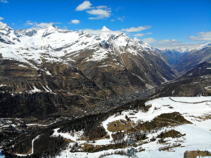 | Beim Flug über die Riffelalp mit Blick auf Zermatt. Schweiz, Kanton Wallis 17.04.2021; Flug Nr. 510 |
