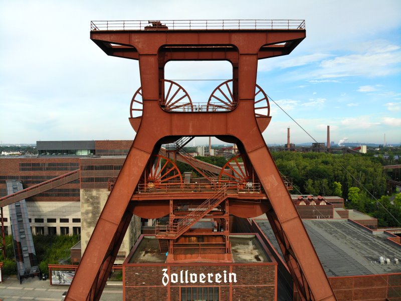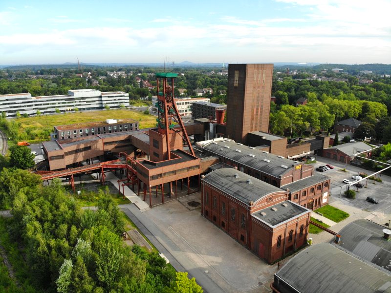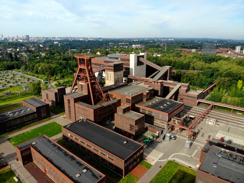 | Die ehemalige Zeche Zollverein Schachtanlagen 1/2/8 in Essen. Deutschland, Nordrhein-Westfalen 15.08.2021; Flug Nr. 579  |