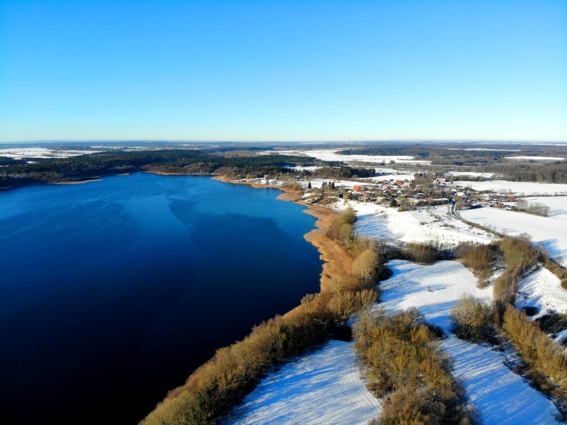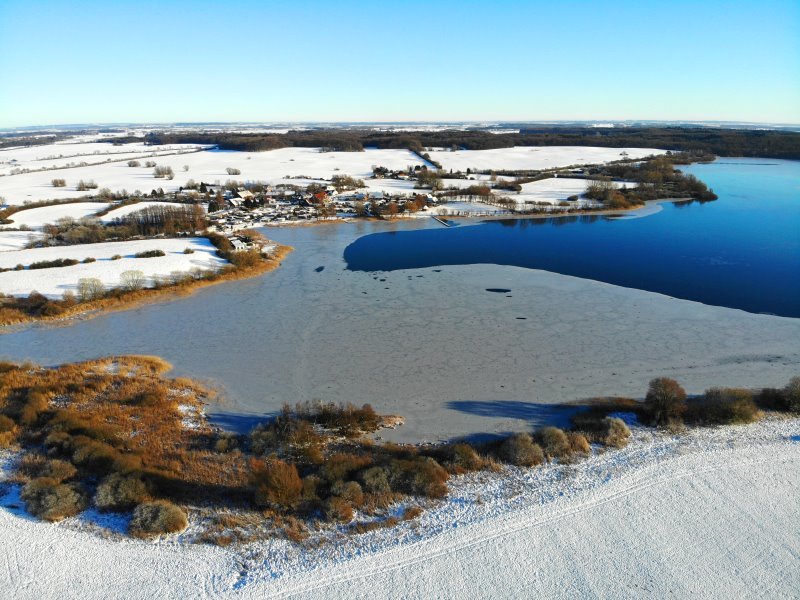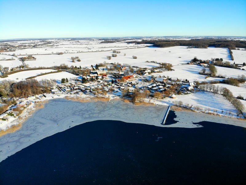 | Blick über den Röggeliner See auf Klocksdorf. Deutschland, Mecklenburg-Vorpommern 26.12.2021; Flug Nr. 638 |