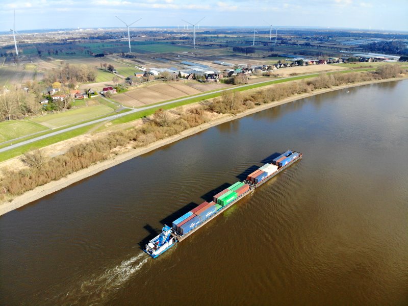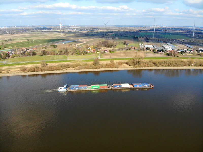 | Ein Container-Schubverband vom Hamburger Hafen auf der Elbe bei Hamburg-Ochsenwerder. Deutschland, Hamburg 05.03.2022; Flug Nr. 653 |