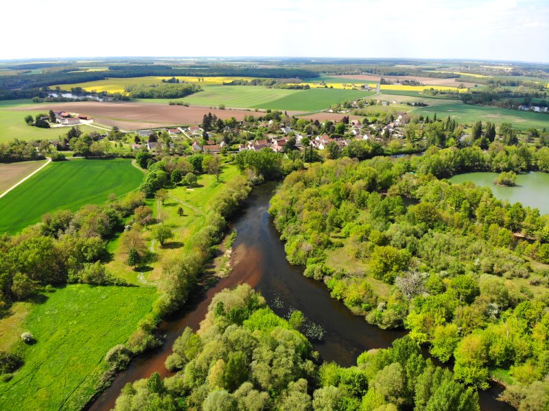 | Eine verwunschene Siedlung in der Auenlandschaft vom Cher. Frankreich, Département Cher 26.04.2022; Flug Nr. 695 |