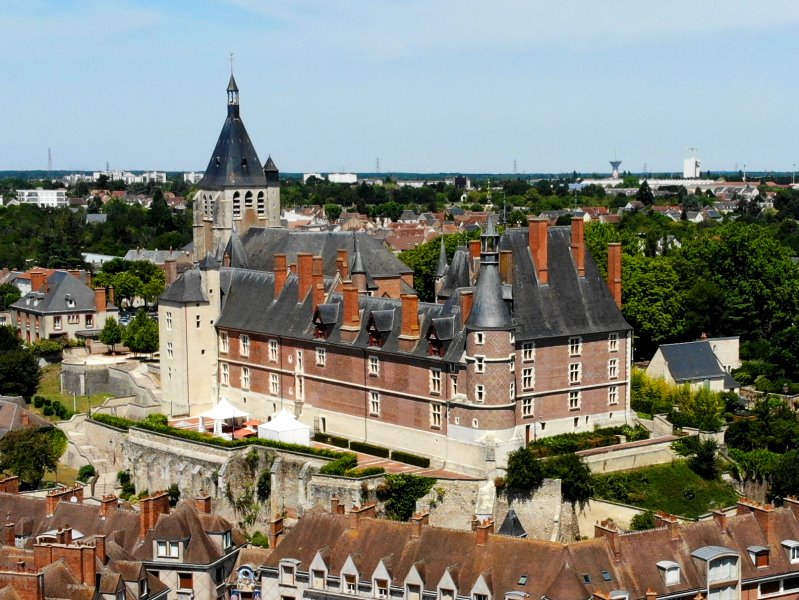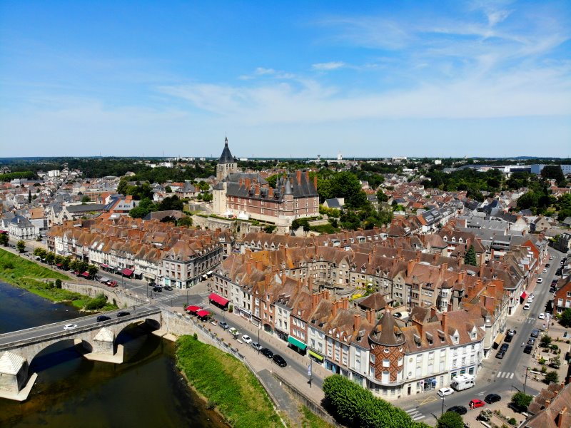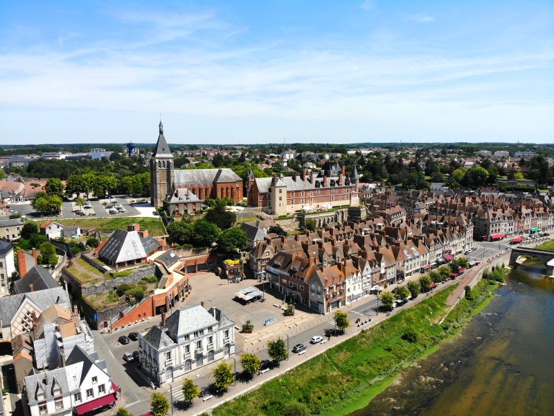| Blick auf Gien mit dem Schloss und der Pfarrkirche Sainte-Jean d'Arc. Frankreich, Département Loiret 17.07.2022; Flug Nr. 770 |