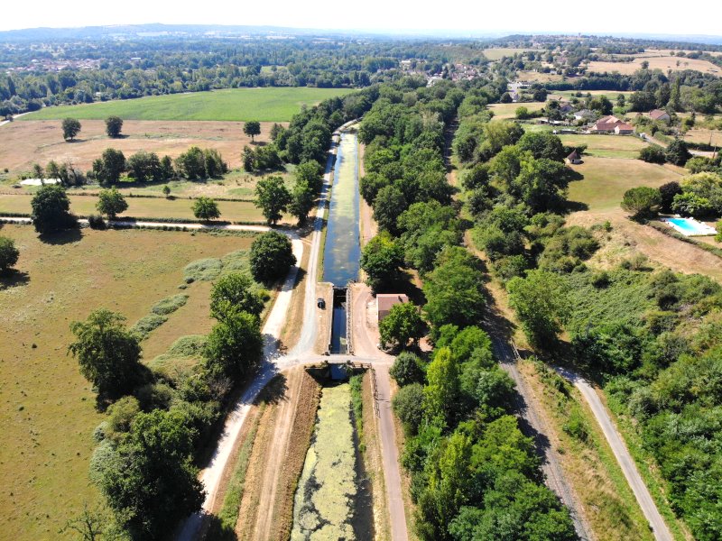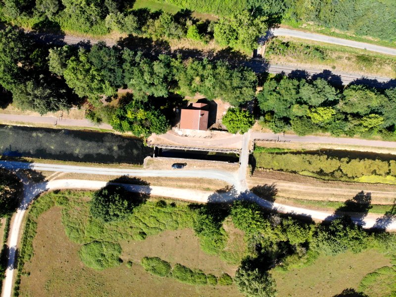 | Die Schleuse Rouéron am Canal de Berry. Frankreich, Département Allier 07.08.2022; Flug Nr. 779 |