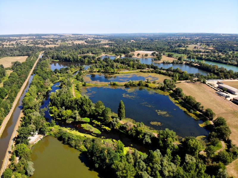 | Die Teichlandschaft am Cher und dem Canal de Berry bei Rouéron. Frankreich, Département Allier 07.08.2022; Flug Nr. 779 |