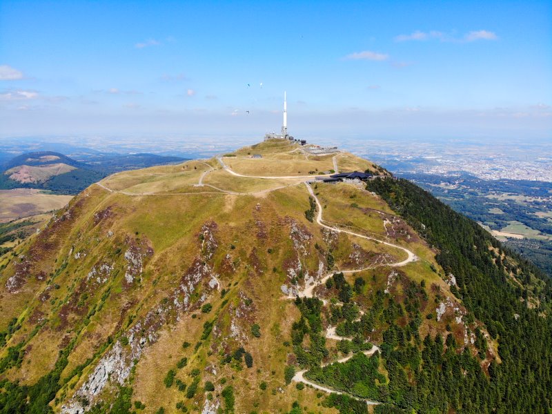 | Der Gipfel des ehemaligen Vulkans Puy-de-Dôme. Frankreich, Département Puy-de-Dôme 07.08.2022; Flug Nr. 780 |