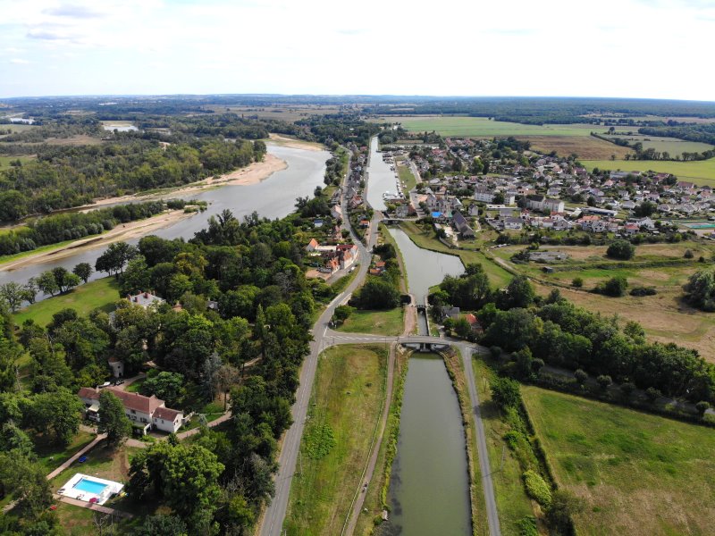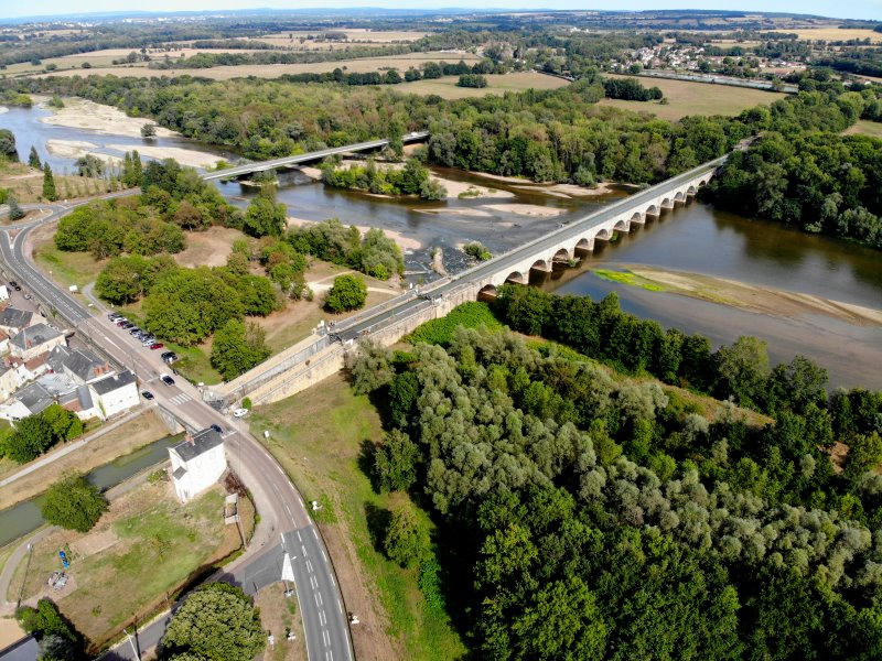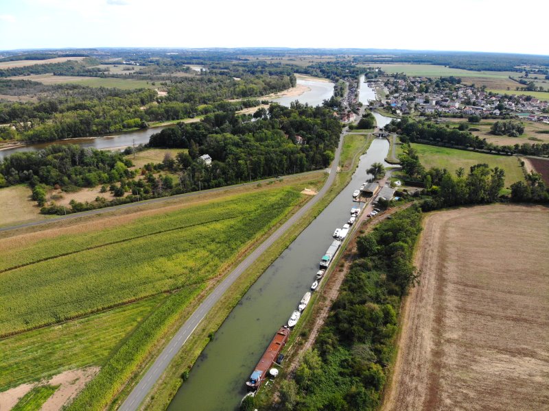 | Le Guétin mit dem Kanalhafen und der Trogbrücke über den Allier. Frankreich, Département Cher 27.08.2022; Flug Nr. 786 |