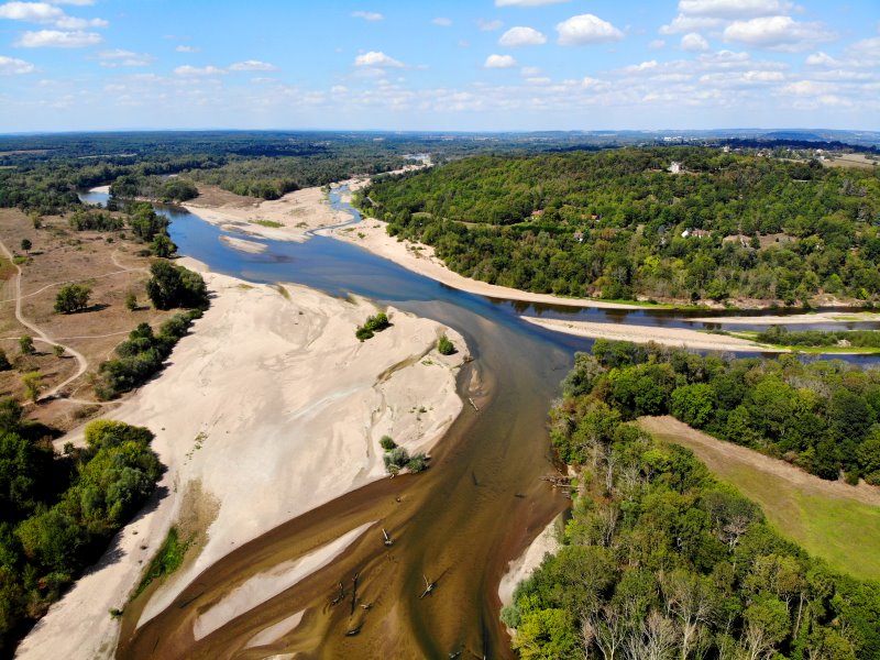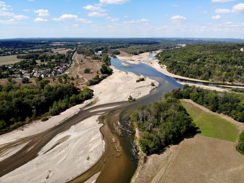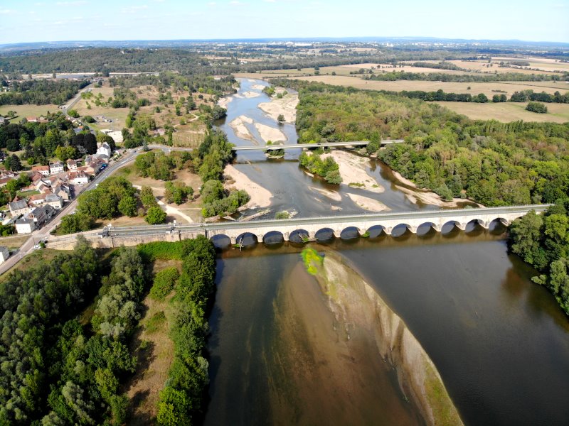 | Der ausgetrocknete Allier mündet in die ausgetrocknete Loire. Frankreich, Département Cher / Département Nèvre 28.08.2022; Flug Nr. 789 |