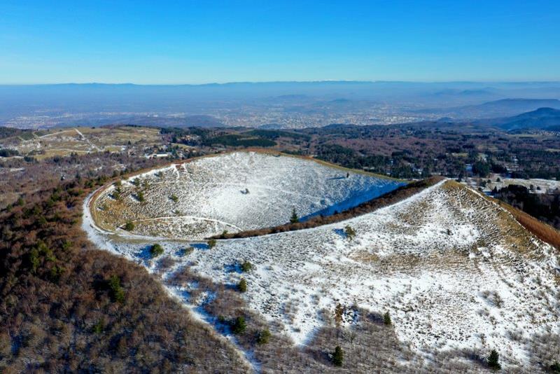 | Die Vulkankette "La Chaîne des Puys" bei Clermont-Ferrand. Frankreich, Département Puy-de-Dôme 11.02.2023; Flug Nr. mp004 |