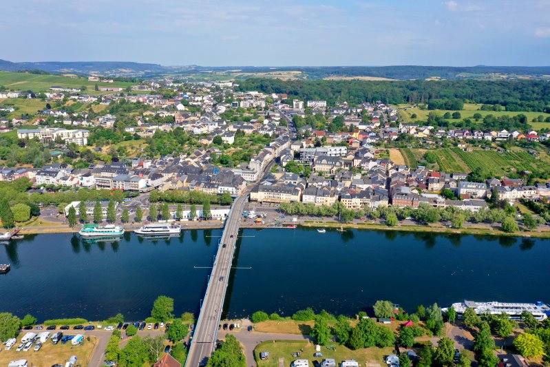 | Blick über die Mosel auf Remich. Deutschland, Saarland / Luxemburg, Kanton Remisch 18.06.2023; Flug Nr. mp080 |