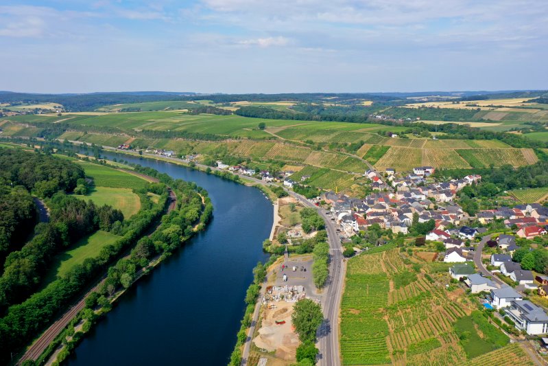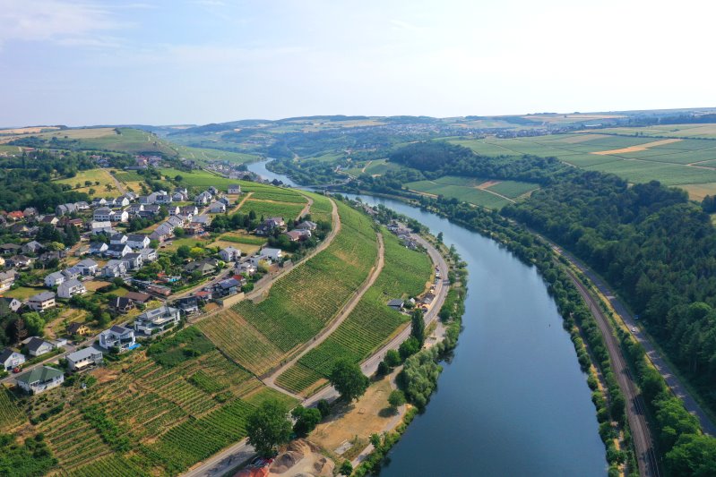 | Die Mosel zwischen Wormeldingen und Wincheringen. Luxemburg, Kanton Grevenmacher / Deutschland, Rheinland-Pfalz 18.06.2023; Flug Nr. mp081 |