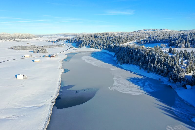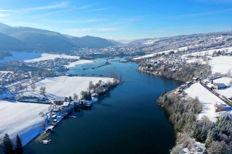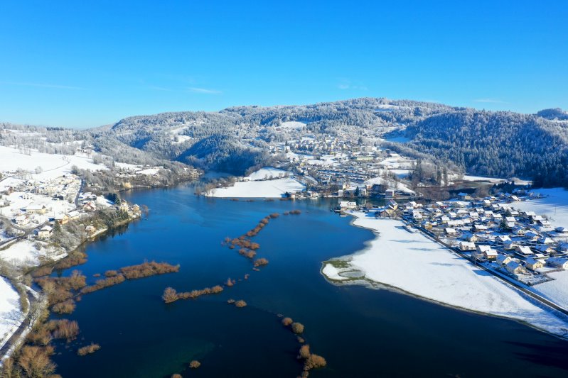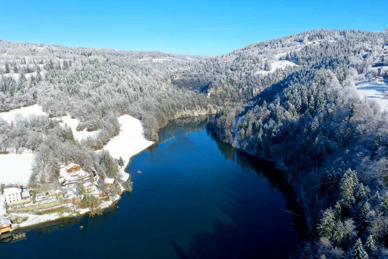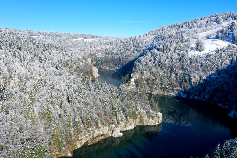 | Blick auf den Lac des Brenets. Schweiz, Kanton Neuchâtel / Frankreich, Département Doubs 03.12.2023 Flug Nr. mp131 |