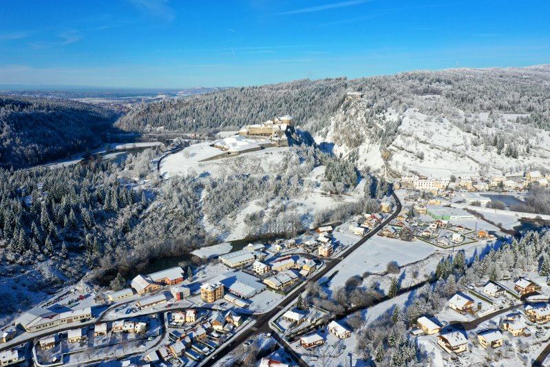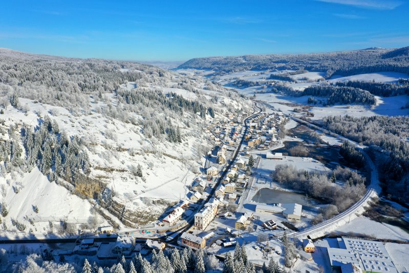 | Blick auf La Cluse-et-Mijoux. Frankreich, Département Doubs 03.12.2023 Flug Nr. mp132 |
