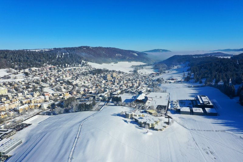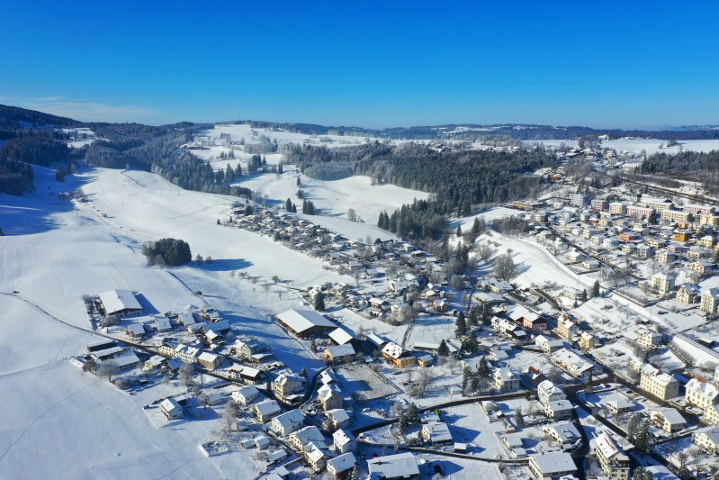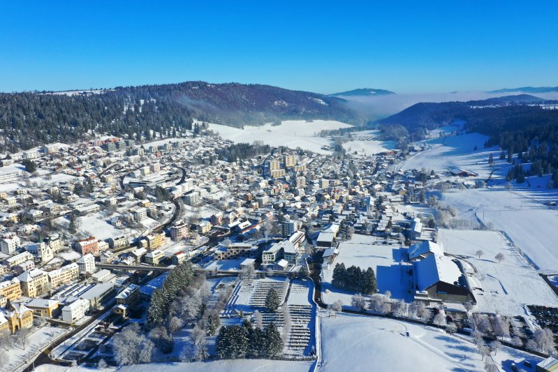 | Blick auf Saignelégier. Schweiz, Kanton Jura 11.01.2024 Flug Nr. mp140 |