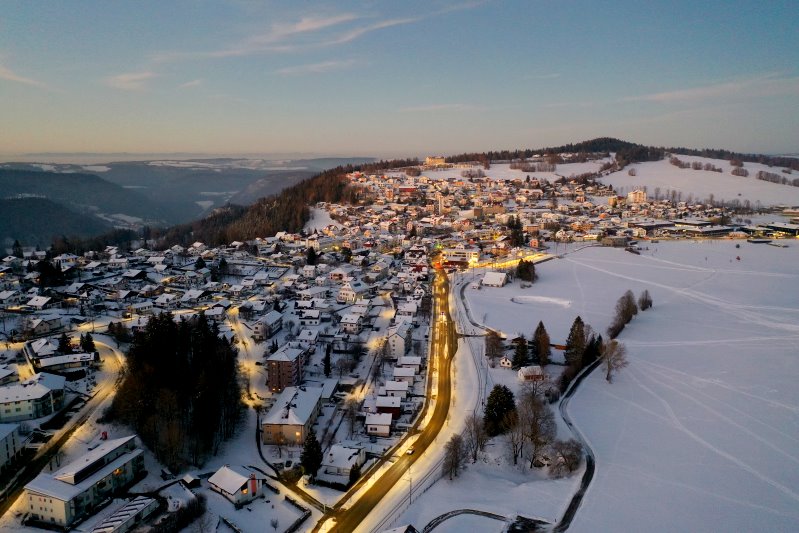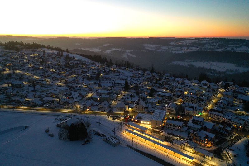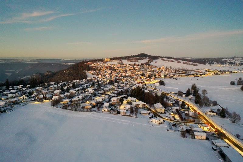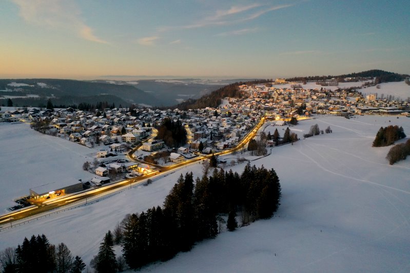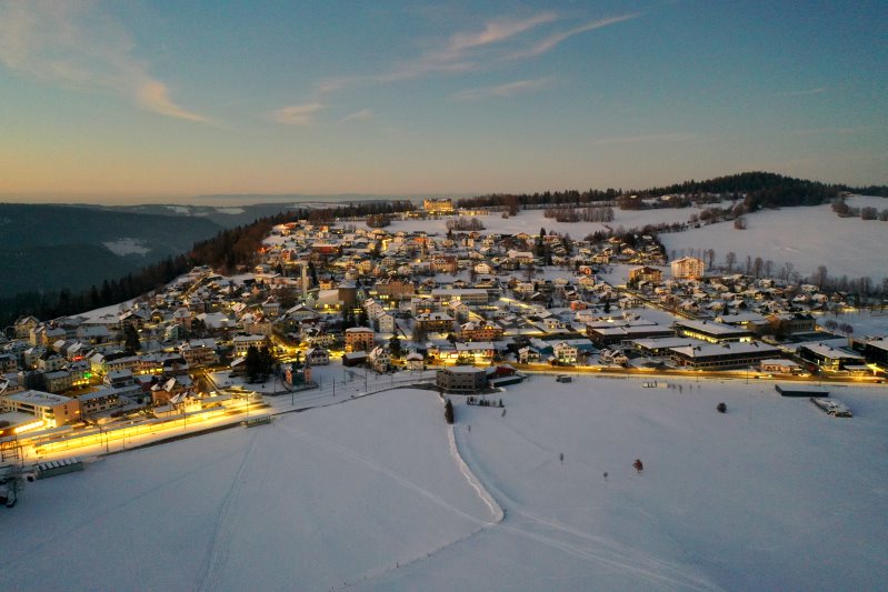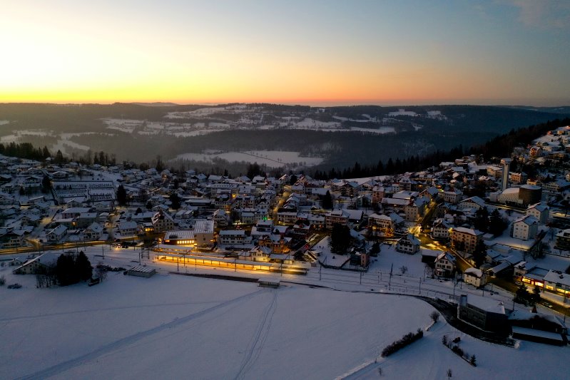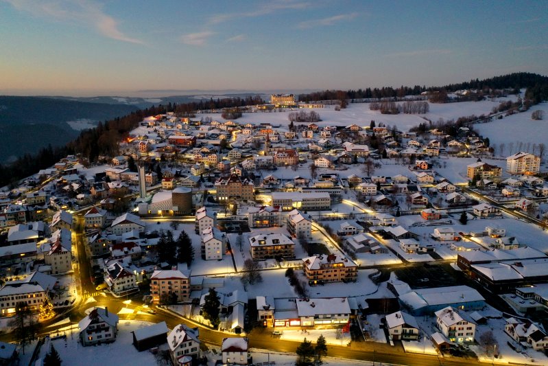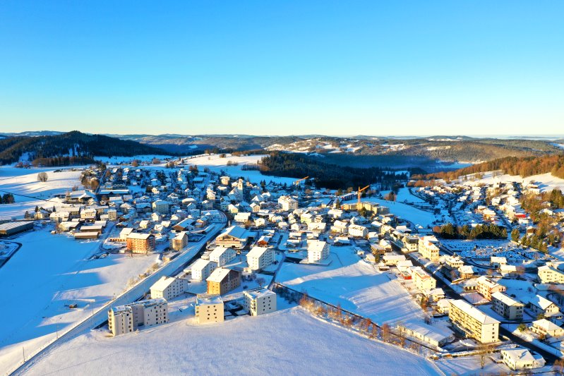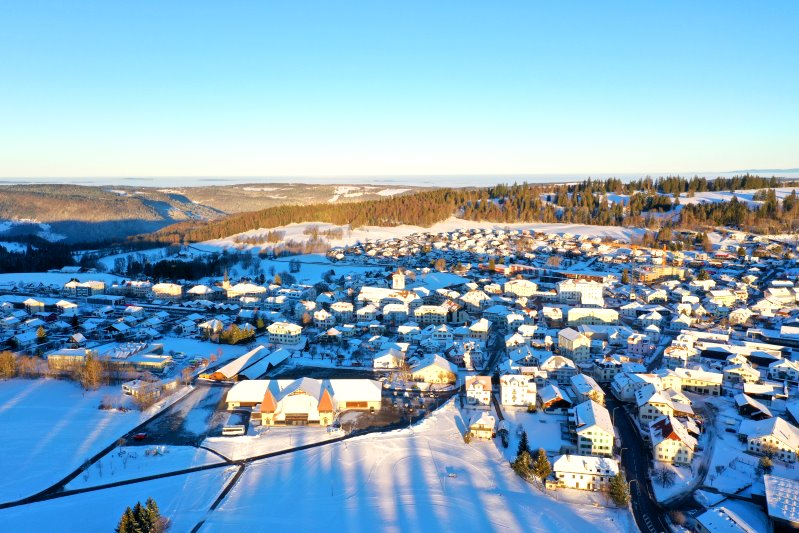| Blick auf Saignelégier. Schweiz, Kanton Jura 13.01.2024 Flug Nr. mp145 |