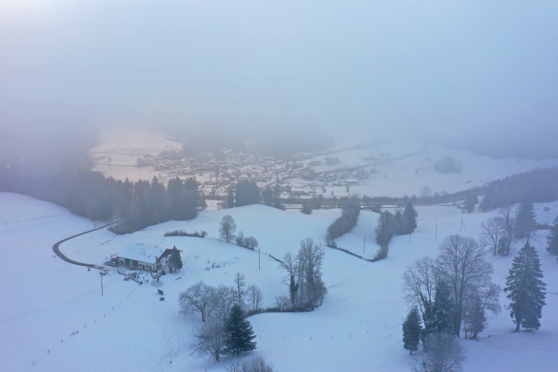 | Blick auf Le Bémont. Schweiz, Kanton Jura 13.01.2024 Flug Nr. mp145 |