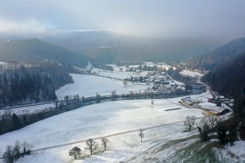 | Das Vallée du Doubs bei Soulce-Cernay. Frankreich, Département Doubs 13.01.2024 Flug Nr. mp147 |
