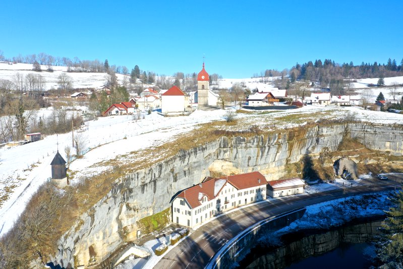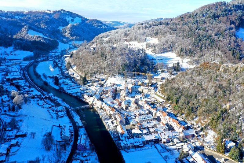 | Blick auf die Altstadt von Saint-Ursanne. Schweiz, Kanton Jura 14.01.2024 Flug Nr. mp156 |