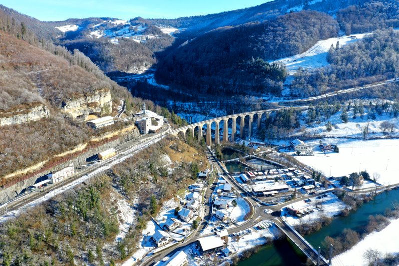| Der Viadukt Combe Meran bei Saint-Ursanne. Schweiz, Kanton Jura 14.01.2024 Flug Nr. mp156 |