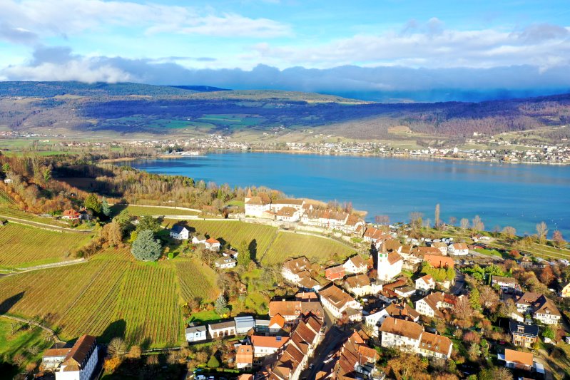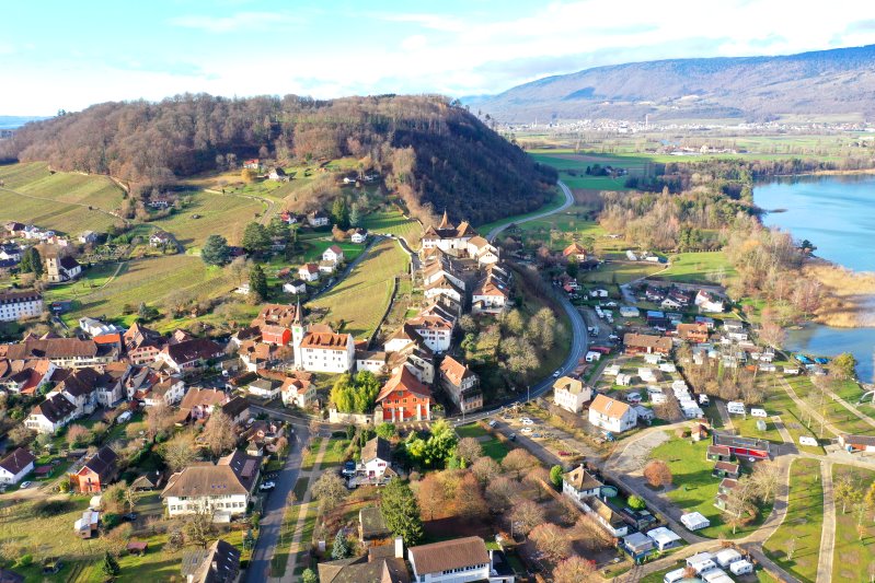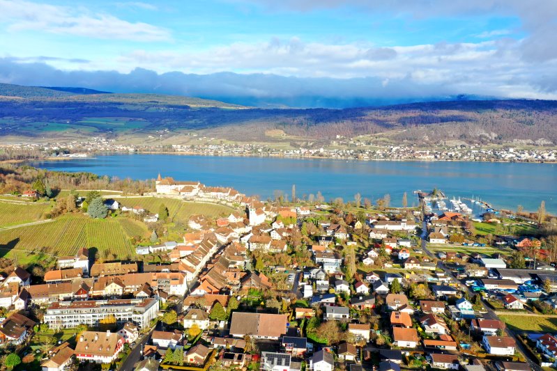 | Blick auf Erlach. Schweiz, Kanton Bern 25.01.2024 Flug Nr. mp157 |