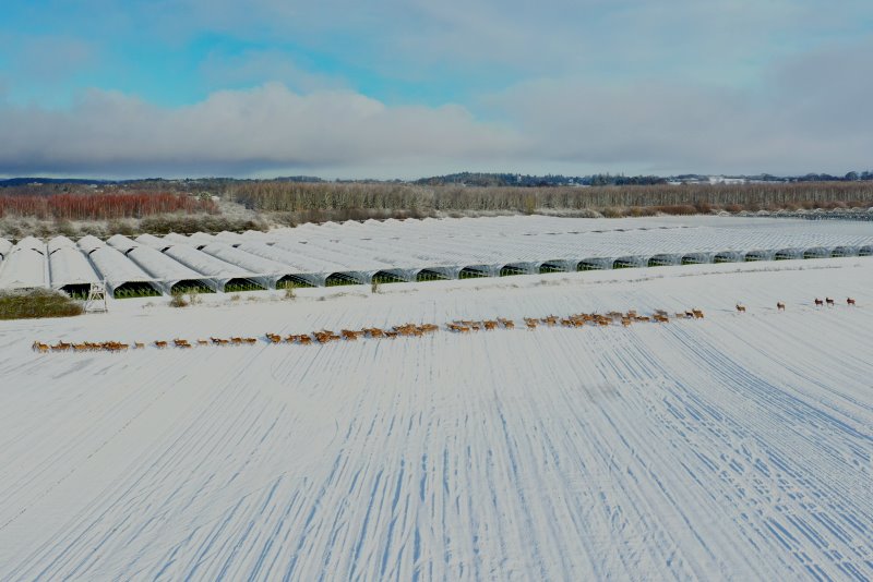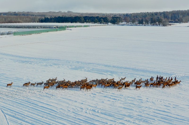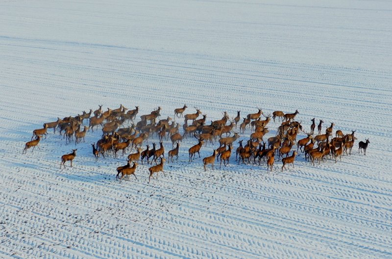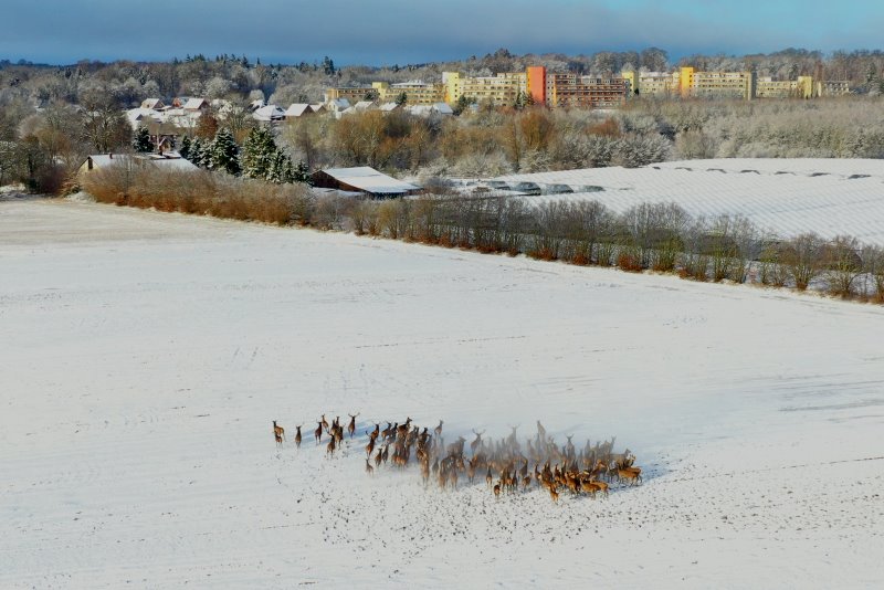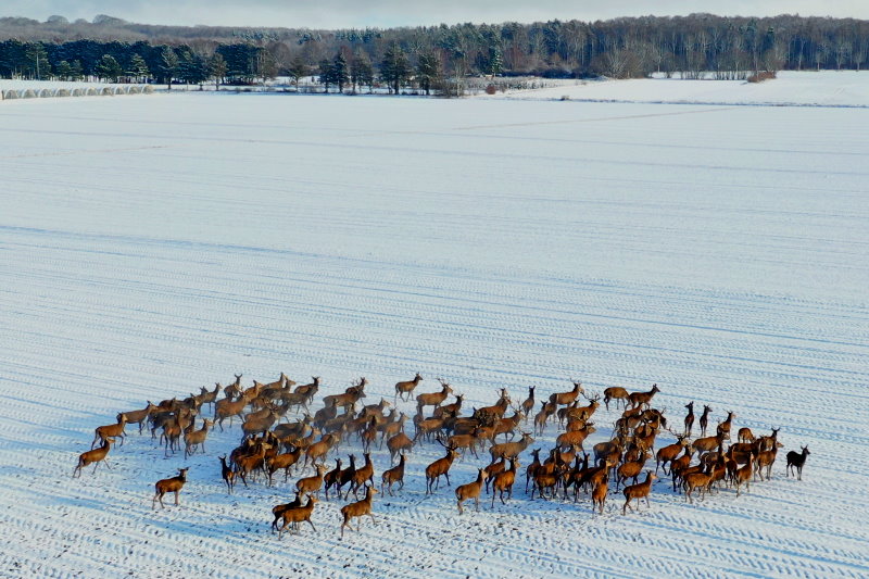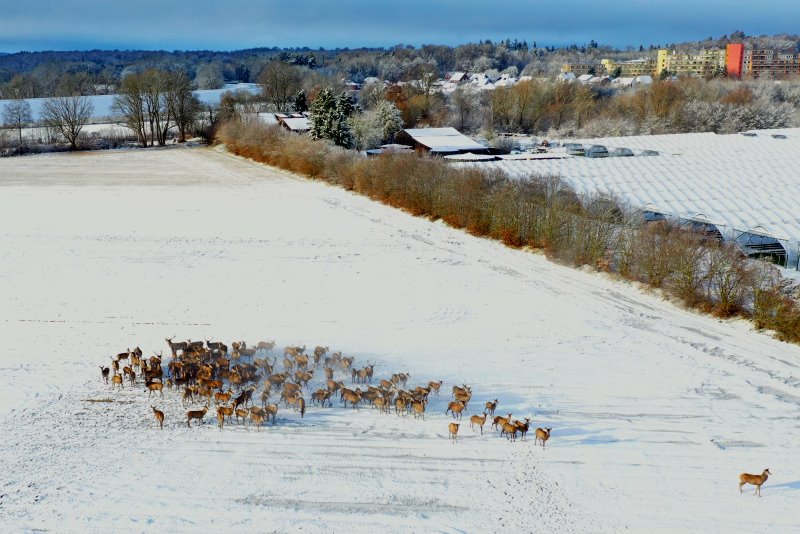 | Eine Rotwildherde mit 130 Tieren zieht über ein Feld bei Ratzeburg. Deutschland, Schleswig-Holstein 03.01.2026 Flug Nr. mp426 |