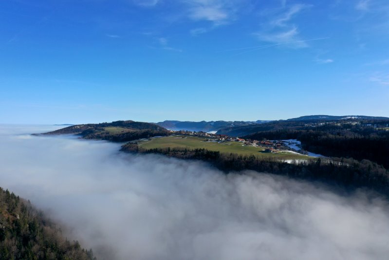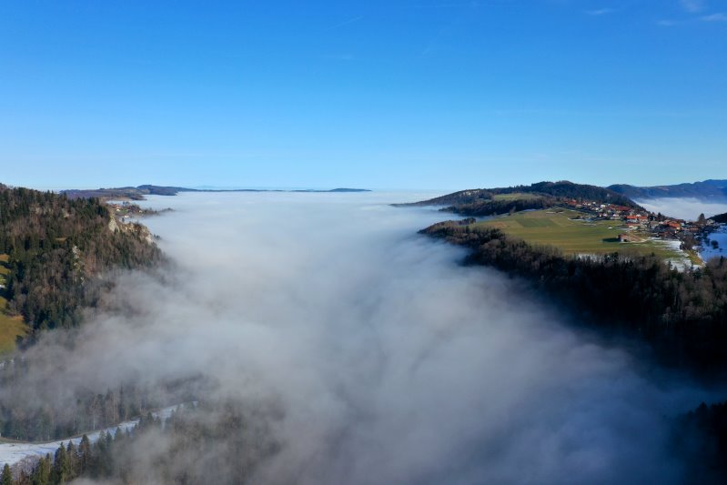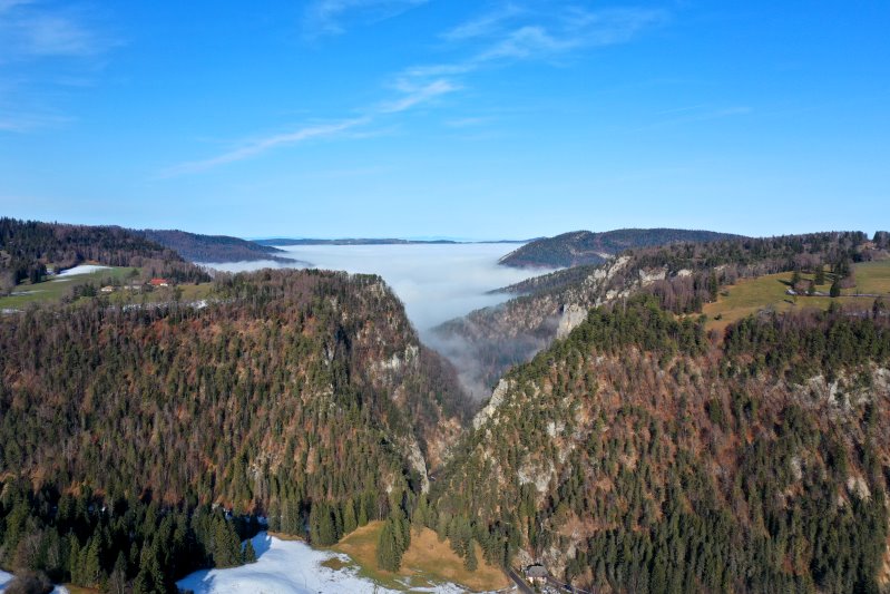 | Blick über das vernebelte Tabeillon-Tal zur Hochfläche von Soulcy. Schweiz, Kanton Jura 18.01.2026 Flug Nr. mp439 |