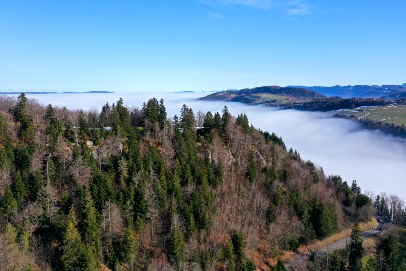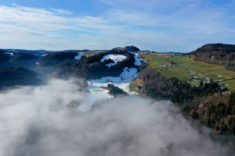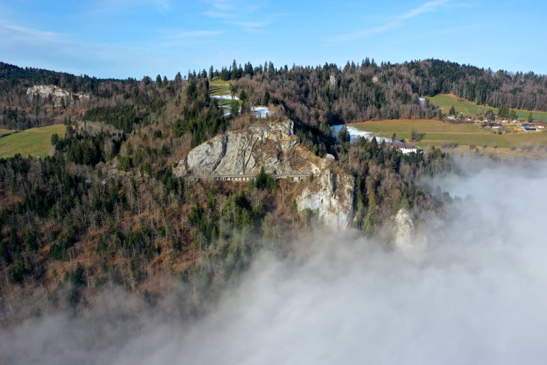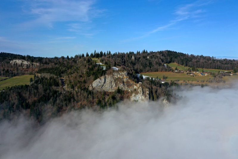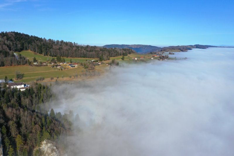 | Die Bergflanke von Sceut ragt aus dem Nebel. Schweiz, Kanton Jura 18.01.2026 Flug Nr. mp439 |