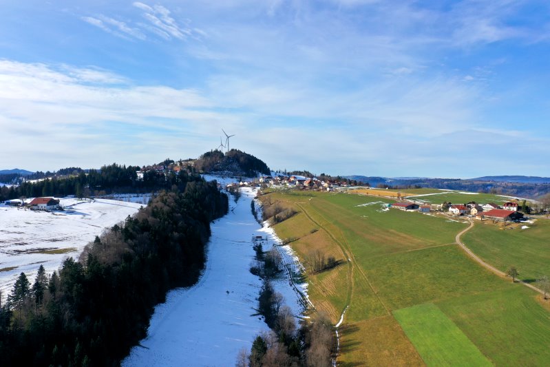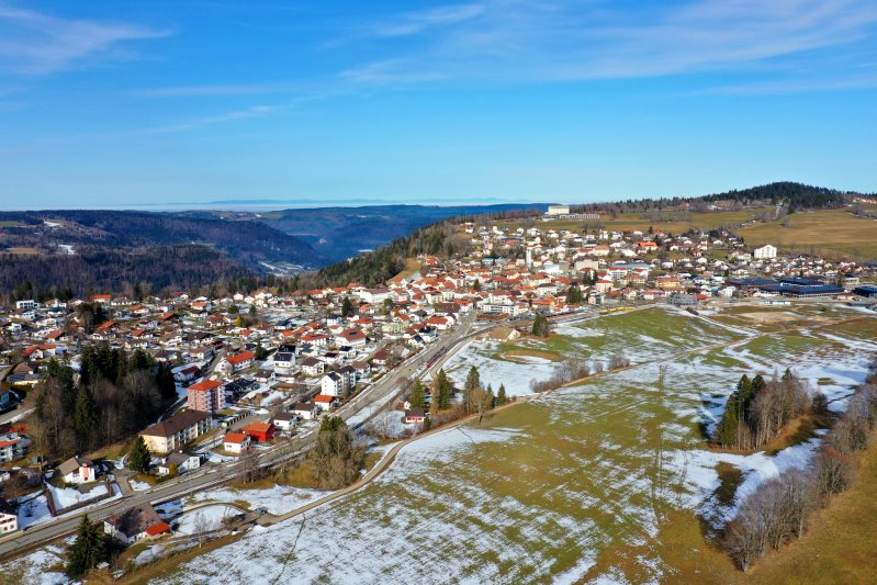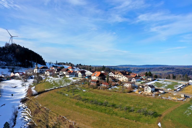 | Blick auf Le Noirmont. Schweiz, Kanton Jura 18.01.2026 Flug Nr. mp440 |