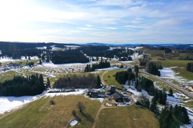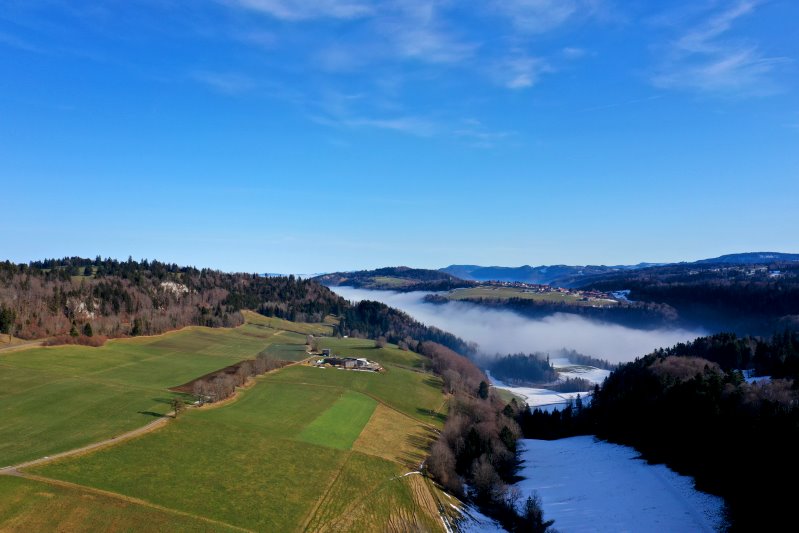 | Blick über die Hochfläche der Freiberge. Schweiz, Kanton Jura 18.01.2026 Flug Nr. mp440 |