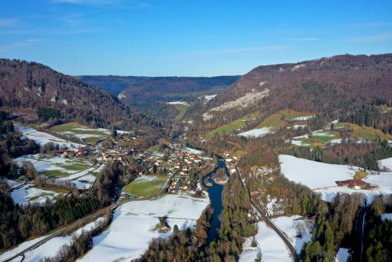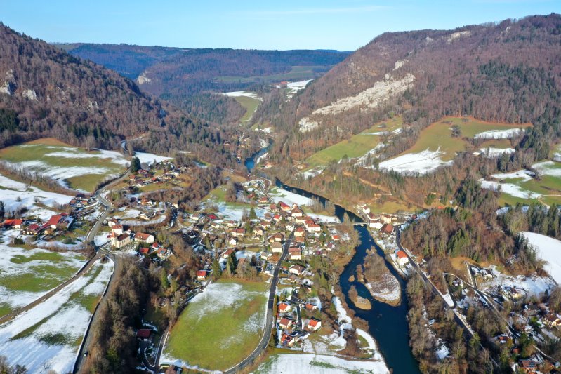 | Blick auf Goumois. Frankreich, Département Doubs / Schweiz, Kanton Jura 18.01.2026 Flug Nr. mp441 |